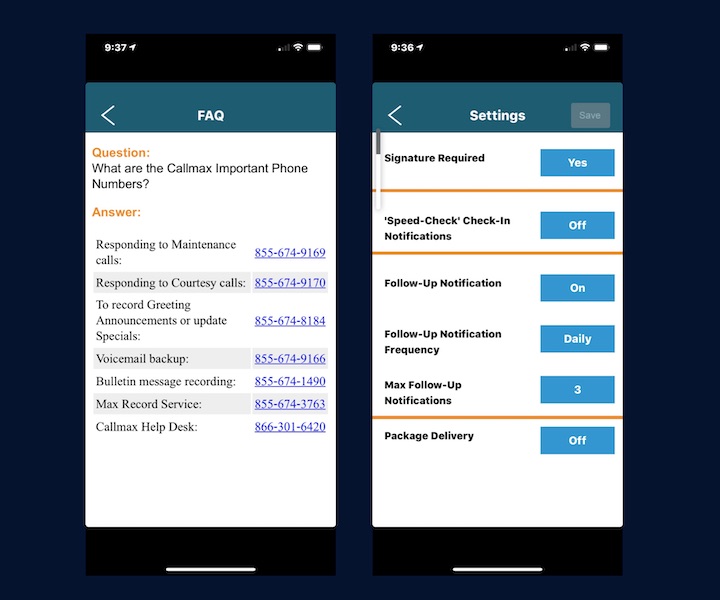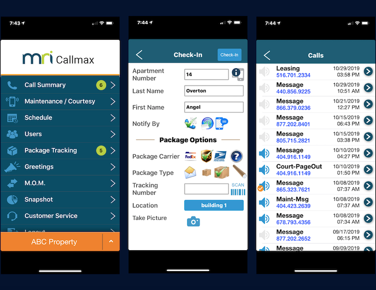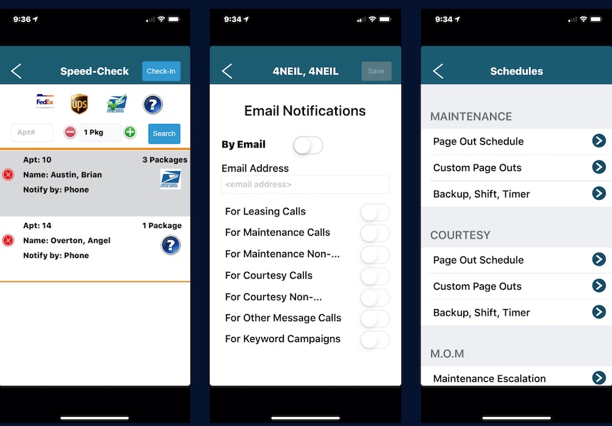 This mobile application provides immediate access to a cloud-based, AI-enhanced automated answering service. It also provides package check-in and check-out functionality with the ability to capture pictures of packages, the scanning of package barcodes, adjust schedules, and manage user access levels.